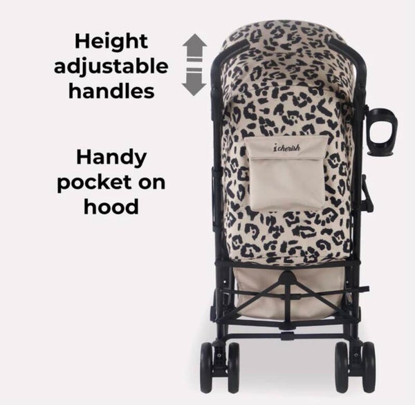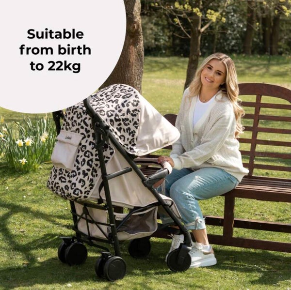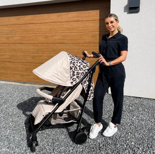 This stylish fawn coloured leopard print stroller from Dani Dyer forms part of her “Cherish” collection at My Babiie and combines the style and function you expect from a super talented mum. Tough enough to take everywhere with you and use everyday, the lightweight aluminium umbrella fold stroller is packed with features to make using it as comfortable for you and your little one as possible. Suitable from birth, the seat reclines right back and has an adjustable leg support so your little can sit, or lay back in total comfort, shade from the sun and elements by an extendable 3 position UPF canopy. Suspension all round and single front wheels means the ride is super smooth, and adjustable handles mean you can push in comfort too. The basket is large and there is a handy pocket at the back of the hood for your phone (or snacks!), and a viewing window so you can maintain a visual on your precious cargo. This lightweight stroller comes with a free cosy footmuff, cup holder and rain cover so that if you are strolling and it starts to rain, we have you covered!