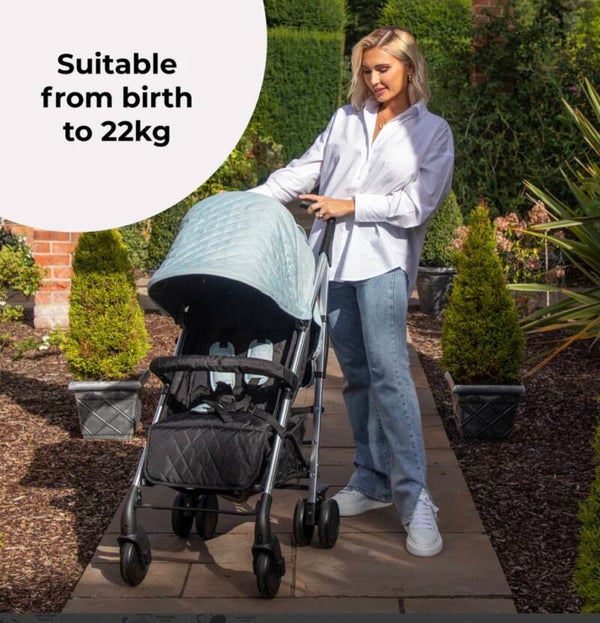 This stylish quilted aqua stroller design from Billie Faiers forms part of her “Signature Range” at My Babiie and combines the style and function you expect from a super talented mum. Tough enough to take everywhere with you and use everyday, the lightweight aluminium umbrella fold stroller is packed with features to make using it as comfortable for you and your little as possible. Suitable from birth, the seat reclines right back and has an adjustable leg support so your little can sit, or lay back in total comfort, shade from the sun and elements by an extendable 3 position UPF canopy. Suspension all round and single front wheels means the ride is super smooth, and adjustable handles mean you can push in comfort too. The basket is large and there is a handy pocket at the back of the hood for your phone (or snacks!), and a viewing window so you can maintain a visual on your precious cargo. This lightweight stroller comes with a free cosy footmuff, cup holder and rain cover so that if you are strolling and it starts to rain, we have you covered!