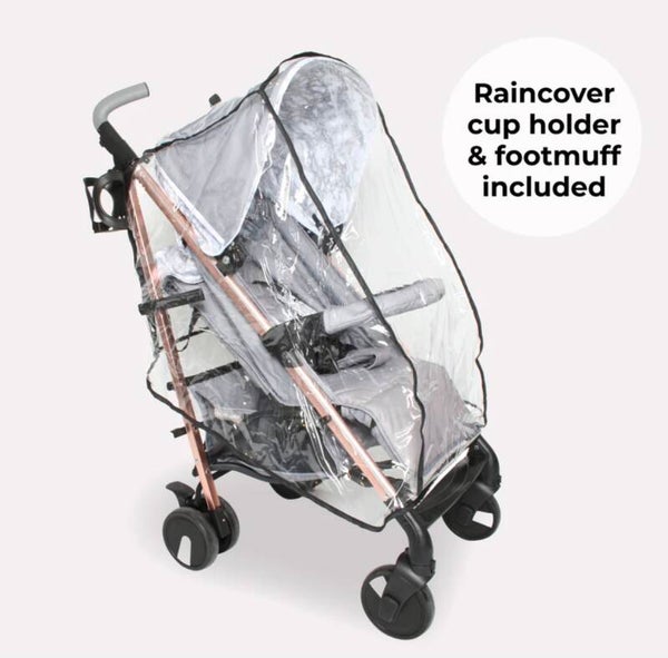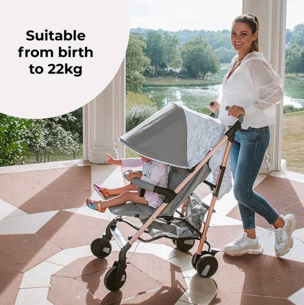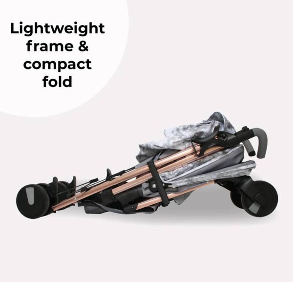 This stylish grey marble design with a rose gold frame design from Samantha Faiers forms part of her “Dreamiie” range at My Babiie and combines the style and function you expect from a super talented mum. Tough enough to take everywhere with you and use everyday, the lightweight aluminium umbrella fold stroller is packed with features to make using it as comfortable for you and your little as possible. Suitable from birth, the seat reclines right back and has an adjustable leg support so your little can sit, or lay back in total comfort, shaded from the sun and elements by an extendable 3 position UPF canopy. Suspension all round and single front wheels means the ride is super smooth, and adjustable handles mean you can push in comfort too. The basket is large and there is a handy pocket at the back of the hood for your phone (or snacks!), and a viewing window so you can maintain a visual on your precious cargo. This lightweight stroller comes with a free cosy footmuff, cup holder and rain cover so that if you are strolling and it starts to rain, we have you covered!
