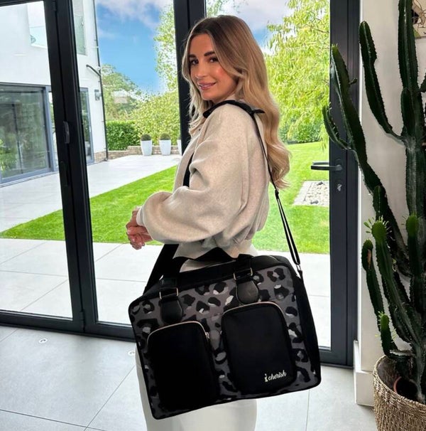 The stylish and practical Dani Dyer "Cherish" black leopard print changing bag with rose gold detailing provides you with plenty of space to store all your baby's necessities when you're out and about. This changing bag comes with a padded changing mat, insulated bottle holder, 2 pockets at the front and an internal pocket, perfect for all your bits and bobs. The adjustable and padded shoulder straps makes carrying this changing bag easy and comfortable