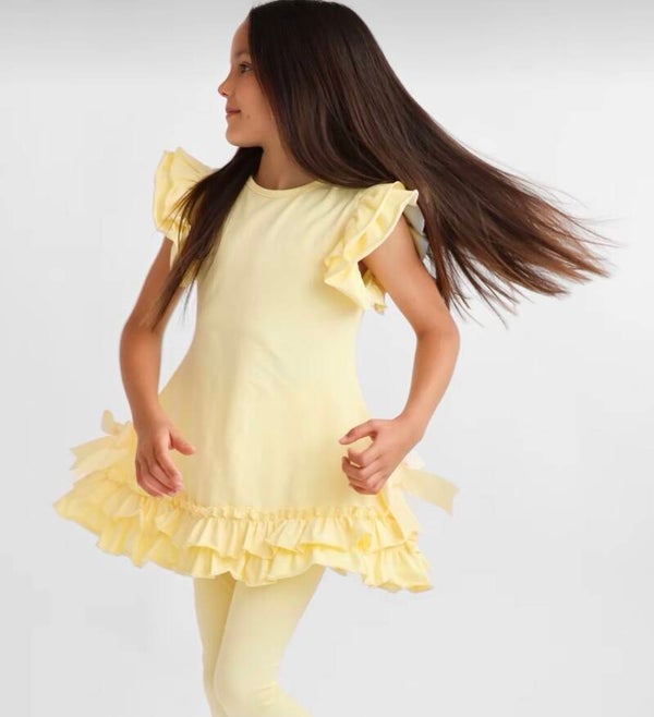 A beautiful girls soft cotton tracksuit with a frilly hem, there is ribbon bows on either side.
