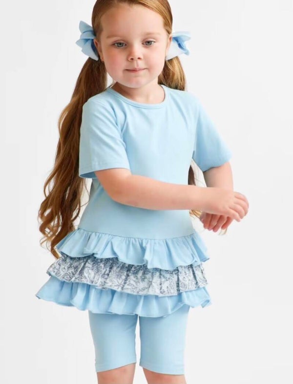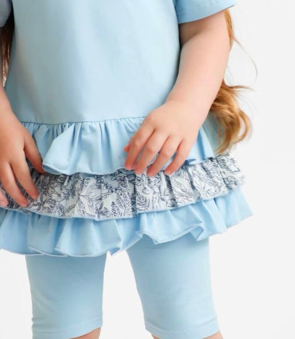 A stunning frilly top with a paisley print in the middle frill, this set comes with cycling shorts and also leggings so it's perfect for both warm and chilly days.