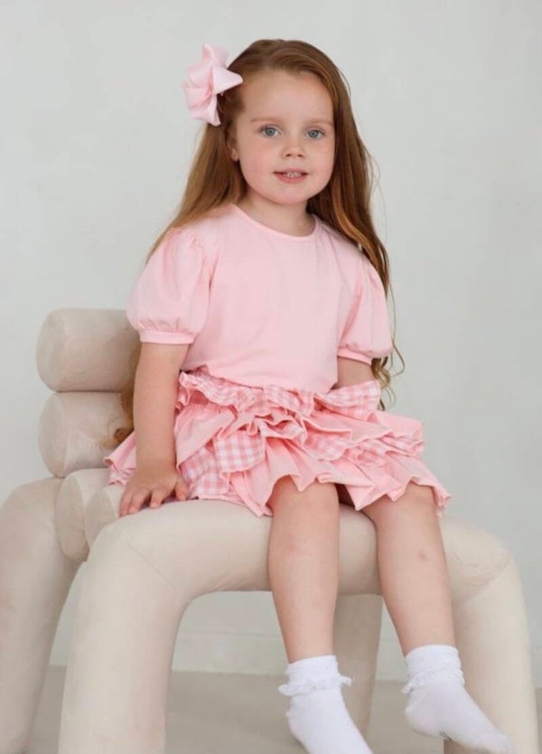 A beautiful girls soft cotton checked ruffled rara skirt with a matching pink puffball shoulder short sleeved top.