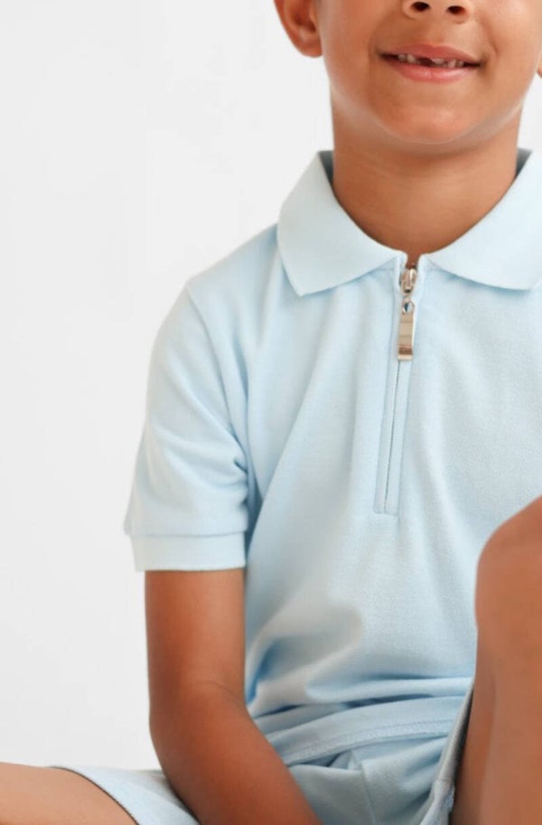 boys hayden zip up polo top is super smart teamed up with matching shorts. This set is made from luxury pique cotton.