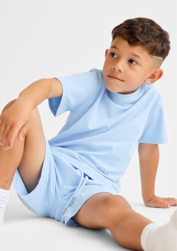 A boys plain blue t shirt and short set from harris kids, the shorts have a adjustable waist that can be pulled in