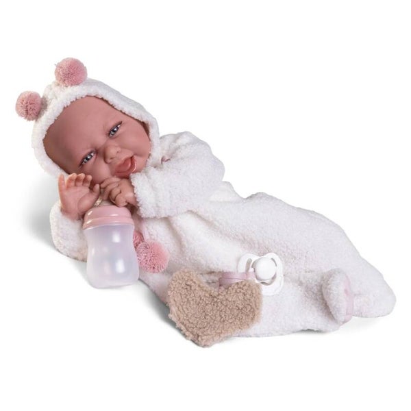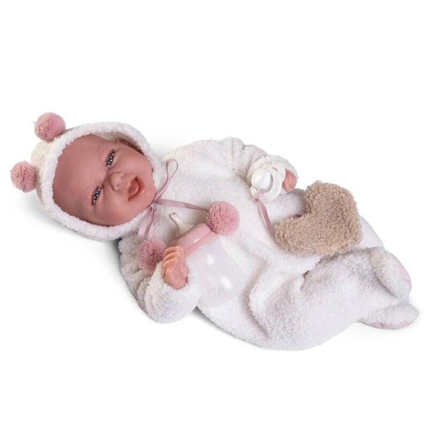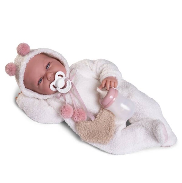 Carla is the same weight as a newborn, she is charming treasure and offers a deeply emotional and realistic play experience. Designed to replicate the feeling of holding a real baby, Carla's specific weight makes her an exceptional companion, inviting children to engage in nurturing interactions. With her sweet expression and cosy sheepskin jumper adorned with a hood and playful pompoms, Carla is perfect for being cared for and loved, fostering feelings of tenderness and compassion during each play session.