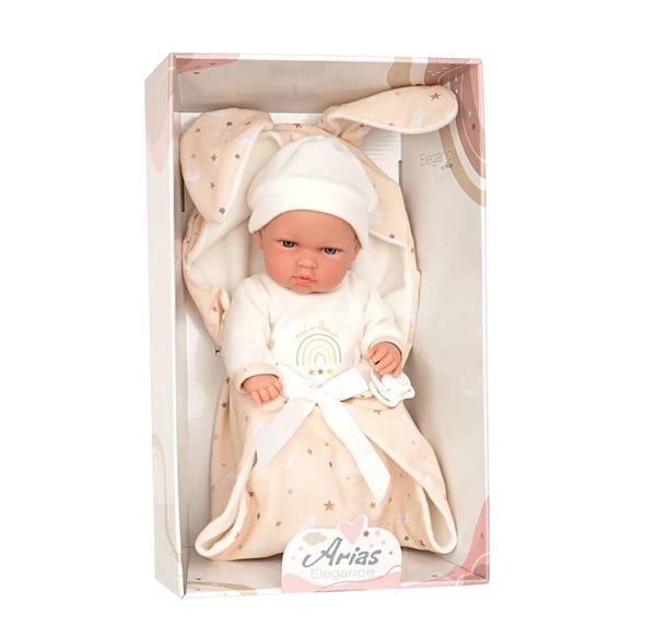 The little ones in the house will share very funny moments with this sweet baby. Her touch is very soft and also gives off a pleasant aroma of vanilla that will make you not want to leave her side. Her clothes and blanket in beige and white tones have been made with high-quality fabrics. Includes pacifier and blanket as accessories. Playing with dolls is very beneficial as it encourages affectivity, language, responsibility and, above all, imagination.