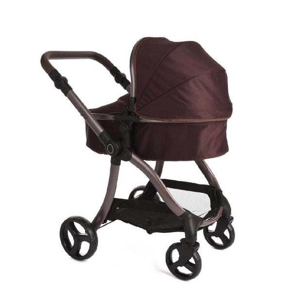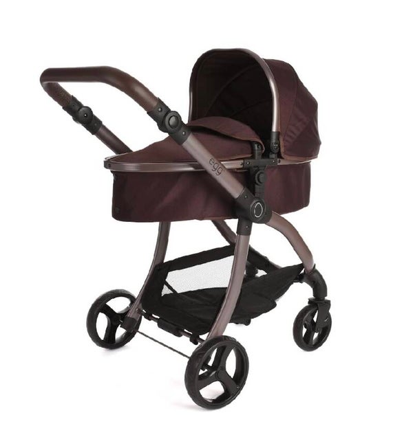 Included in the box is a coordinating apron for use in carrycot mode. The fabrics are the same stunning Hush Violet colourway found on the full size egg2® stroller. Finished on a gloss chassis with cocoa leatherette hand-stitched handle bar.